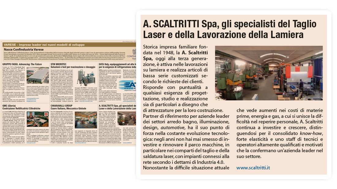 La nostra azienda viene inserita nel quotidiano Il Sole 24 Ore in data 11/01/2023, tra le "imprese leader nei nuovi modelli di sviluppo" in occasione della nascita di Confindustria Varese: